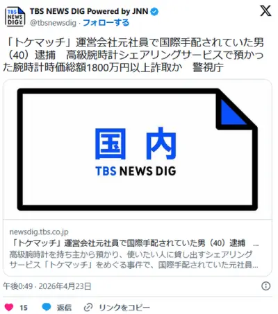 「トケマッチ」運営会社元社員で国際手配の男(40)逮捕 高級腕時計シェアリングサービスで預かった腕時計時価総額1800万円以上詐取か