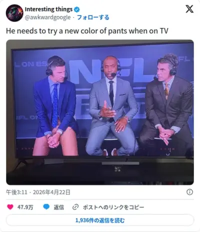 【画像】NFL解説者さん、ズボンの色が肌と完全一致して放送事故みたいになってしまう