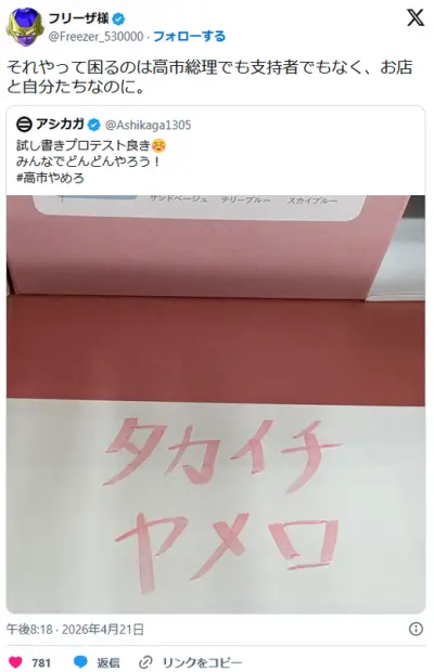今度は文房具の試し書きコーナーで「タカイチヤメロ」と書き込むパヨクが現れる