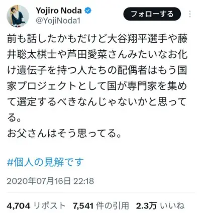 【悲報】RADWIMPS野田洋次郎さん「大谷翔平や芦田愛菜みたいな優良遺伝子の結婚相手は国が選定すべき」