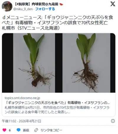 【北海道】「ギョウジャニンニクの天ぷらを食べた」自宅の庭に観賞用に植えていた有毒植物・イヌサフランの誤食で70代女性死亡 札幌市