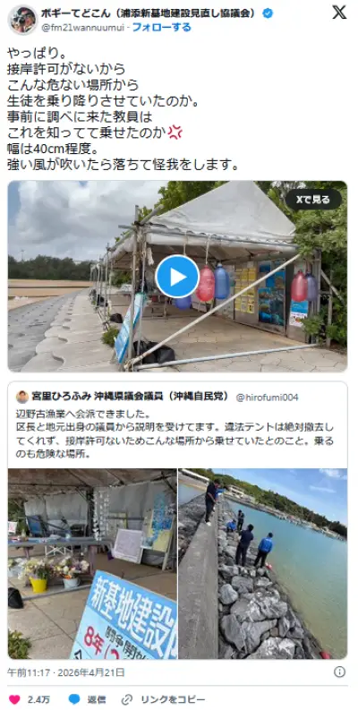 辺野古の抗議船、接岸許可がないため、危険な場所で生徒を乗り降りさせていた