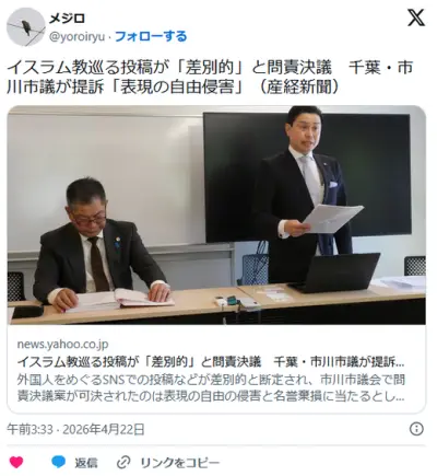 イスラム教巡る投稿が「差別的」と問責決議 千葉・市川市議が提訴「表現の自由侵害」 (千葉地裁)