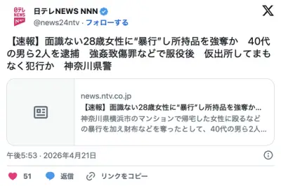 【神奈川】面識ない28歳女性に“暴行”し所持品を強奪か 40代の男ら2人を逮捕 強姦致傷罪などで服役後 仮出所してまもなく犯行か