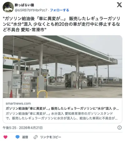 「走行したら車に異変」レギュラーガソリンに水が混入、客からの連絡で発覚