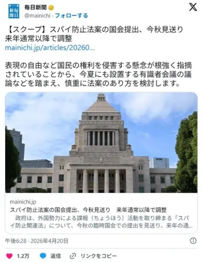 【スクープ】スパイ防止法案の国会提出、今秋見送り 来年通常以降で調整 | 毎日新聞