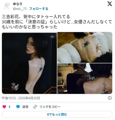 【女優】三吉彩花、「30歳で人生の新しい章を始めようと思ったとき、刺青が浮かんだ」背中に大胆な一輪の花タトゥーを入れ賛否