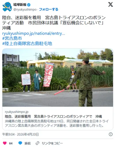 陸自、迷彩服を着用 宮古島トライアスロンのボランティア活動 市民団体は抗議「宣伝機会にしないで」