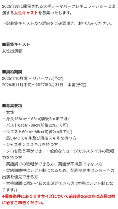 【悲報】大手テーマパーク、女性ショーキャストの求人要項wwwwww