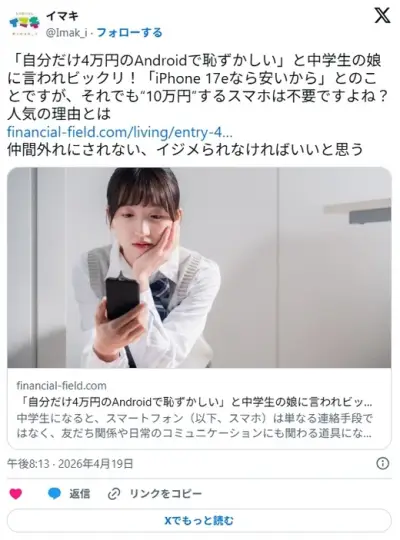 【私だけ4万Androidで恥ずかしい】中学の娘に不満言われた母が最安iPhone17e検討も約10万円で二の足へ