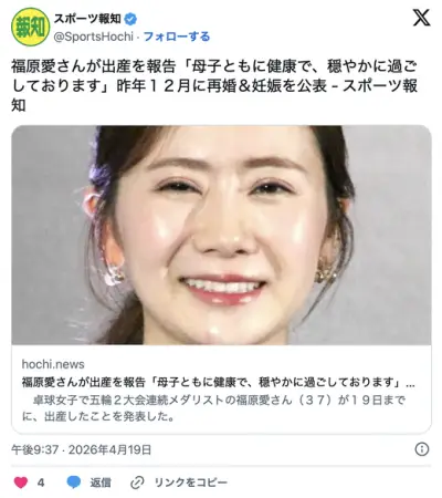 福原愛さん、出産を報告。昨年再婚