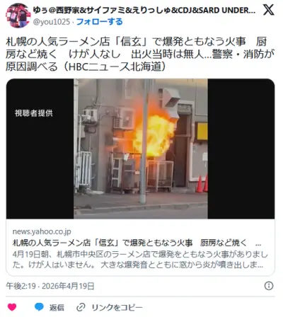 札幌のラーメン店「信玄」で爆発ともなう火事 厨房など焼く けが人なし 出火当時は無人…