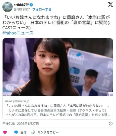 「いいお嫁さんになれますね」に周庭さん「本当に訳がわからない」 日本のテレビ番組の褒め言葉に疑問