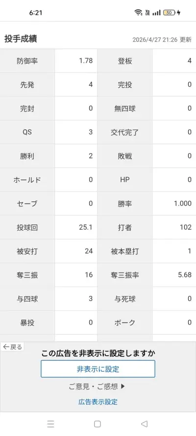 千賀滉大 5先発 0勝4敗 防御率9.00 被打率.313 K/BB1.77 WHIP1.95