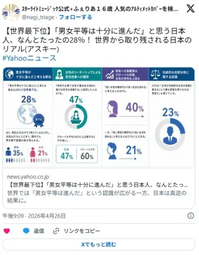世界最下位「男女平等は十分に進んだ」と思う日本人、なんとたったの28%! 世界から取り残される日本のリアル