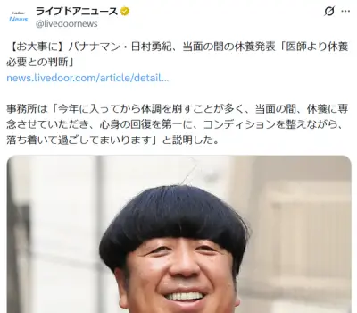 バナナマン日村、当面の間の休養発表