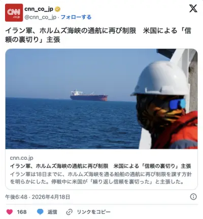 イラン軍、ホルムズ海峡の通航「再び制限」米国による「信頼の裏切り」主張