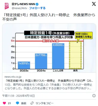 「特定技能1号」外国人受け入れ一時停止 外食業界から不安の声