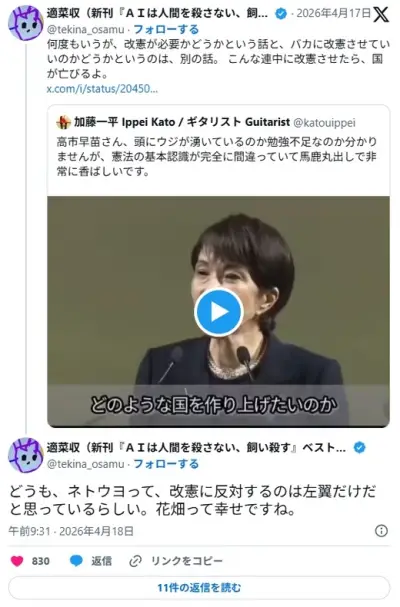作家・適菜収『どうもネトウヨって改憲に反対するのは左翼だけだと思ってるらしい。花畑って幸せだね』
