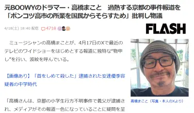 【京都小6男事件】BOOWY元ドラム高橋まこと「ポンコツ高市のアホ所業を国民の目から隠すため」事件報道と政権批判を結び付け波紋