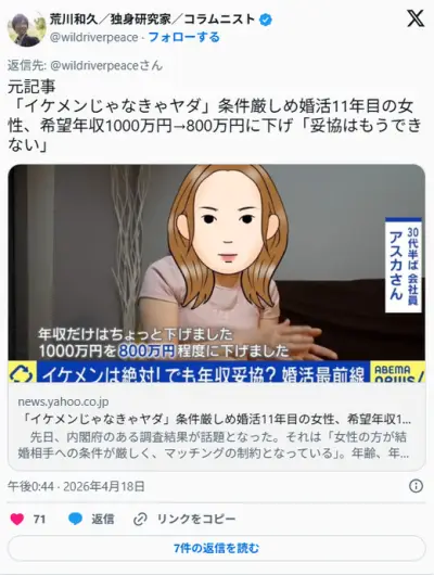 【画像】婚活中女さん(30代半ば)「年収800万のイケメンじゃなきゃヤダ」「私我慢してよくやってる」