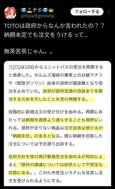 【画像】TOTOさん、政府の圧力で納期未定のまま受注再開してしまう