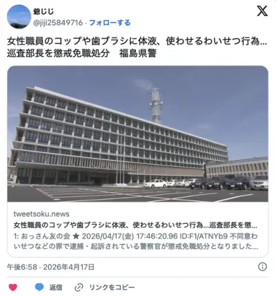 女性職員のコップや歯ブラシに体液、使わせるわいせつ行為…巡査部長を懲戒免職処分 福島県警
