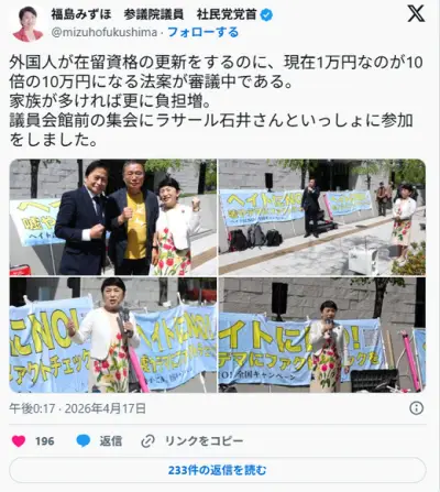 社民党「外国人が在留資格の更新をするのに、現在1万円なのが10倍の10万円になる法案が審議中」