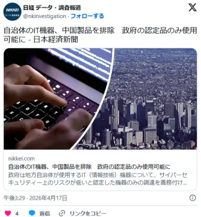 高市政権、中国製品を排除 地方自治体が使用するIT機器は認定品のみ使用に 中国製機器が踏み台の恐れで