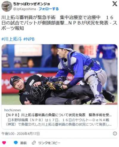【野球】川上拓斗審判員は緊急手術受け集中治療室で治療中 16日の試合でバットが側頭部直撃 NPBが状況を発表
