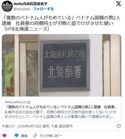 【札幌】「複数のベトナム人がもめている」ベトナム国籍の男2人逮捕 社員寮の同僚同士が刃物と皿でけがさせた疑い