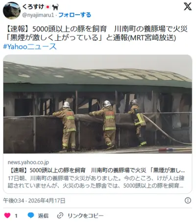 【宮崎県】5000頭以上の豚を飼育 川南町の養豚場で火災 「黒煙が激しく上がっている」と通報