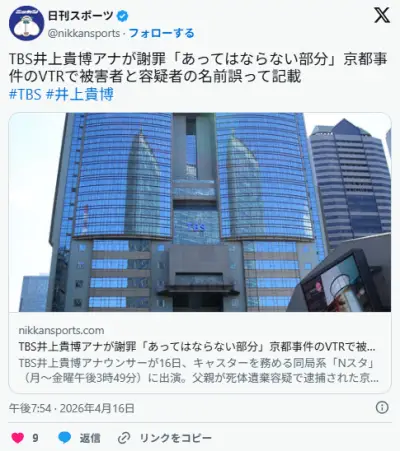 【テレビ】TBS、京都の男児の事件のVTRで被害者と容疑者の名前を誤って記載 井上貴博アナが謝罪「あってはならない部分」
