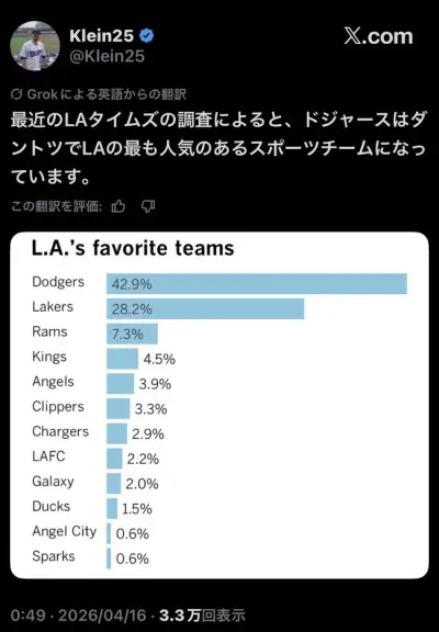 【朗報】LAタイムズ「ロサンゼルスで1番人気な球団はドジャースだわw」