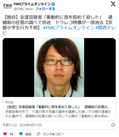【京都男児遺体遺棄】安達優季容疑者「衝動的に首を絞めて殺した」 逮捕前の任意の調べで供述 ドラレコ映像が一部消去