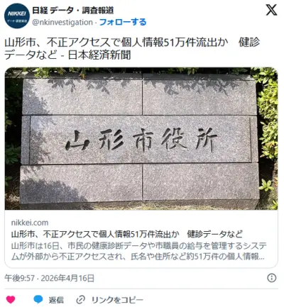 【個人情報流出】山形市、不正アクセスで51万件流出か 健診データなど