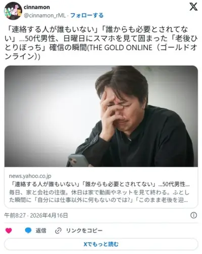 「連絡する人が誰もいない」「誰からも必要とされてない」…50代男性、日曜日にスマホを見て固まった「老後ひとりぼっち」確信の瞬間