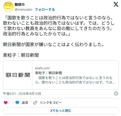 素粒子:朝日新聞 「国歌を歌うことは政治的行為ではないと言うのなら、歌わないことも政治的行為ではないはず」