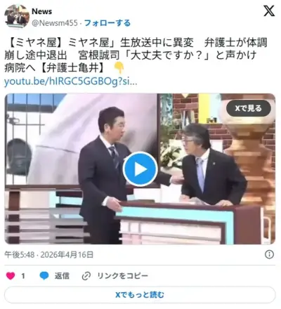 「ミヤネ屋」生放送中に異変 弁護士が体調崩し途中退出 宮根誠司「大丈夫ですか?」と声かけ 病院へ