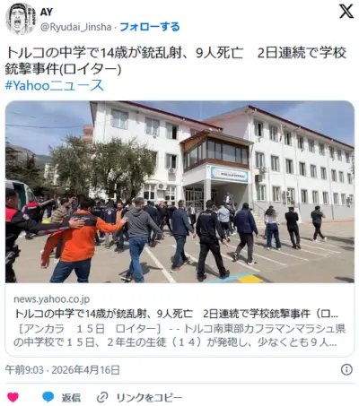 トルコの中学で14歳が銃乱射、9人死亡 2日連続で学校銃撃事件