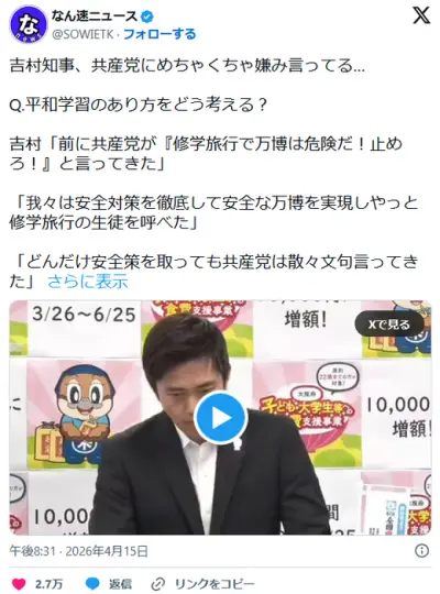 吉村「共産はどんだけ対策しても万博は危険と騒いだのに、なぜ死者が出た辺野古を批判しないんだ?」