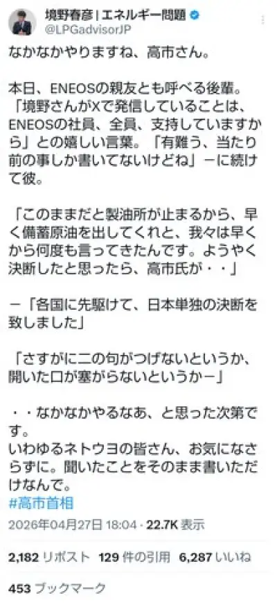 【矛盾】ナフサデマ拡散の境野春彦「ENEOSの社員、全員6月に日本が詰むと思っている」→ENEOSに問い合わせるとリプされ「まともな人として受け取られないと思います」と自分を論破