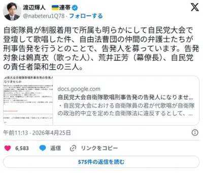 パヨ弁護士、自民党大会で国歌を歌っただけの美人自衛官をスラップ訴訟で追い込むため告発人募集へ