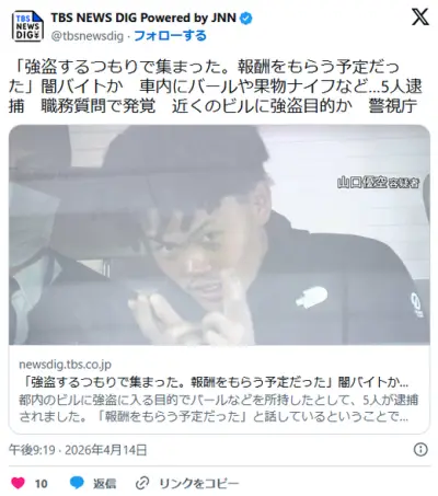 【東京】「強盗するつもりで集まった。報酬もらう予定だった」車内にバールや果物ナイフなど…闇バイト5人逮捕、近くのビルに強盗目的か