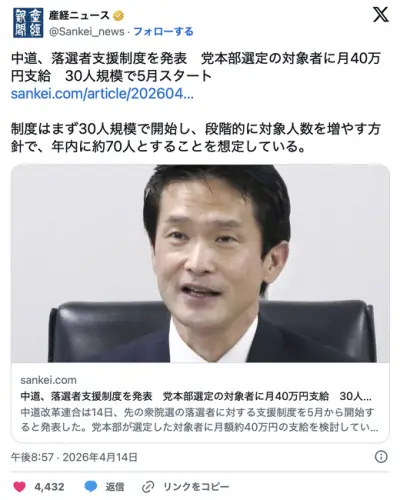 【上級生活保護キタ━!】中道、落選者支援制度を発表「党本部選定の対象者に月40万円支給」