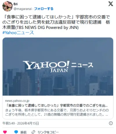 「食事に困って逮捕してほしかった」宇都宮市の交番でのこぎりを出した男を銃刀法違反容疑で逮捕