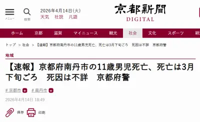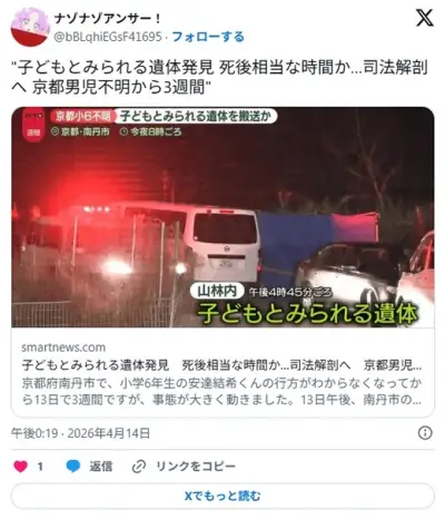 【5chの反応】京都府南丹市の安達結希11歳で確定、死亡時期は3月下旬ごろ 死因は不詳