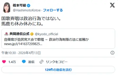 共同通信「自衛官が自民党大会で国歌歌唱 政治行為制限の法に抵触か」 ←🤔