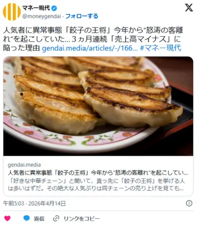 人気者に異常事態「餃子の王将」今年から“怒涛の客離れ”を起こしていた…3ヵ月連続「売上高マイナス」に陥った理由