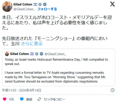 玉川徹氏の人種差別発言についてイスラエル大使がテレビ朝日へ抗議書簡。国際問題へ